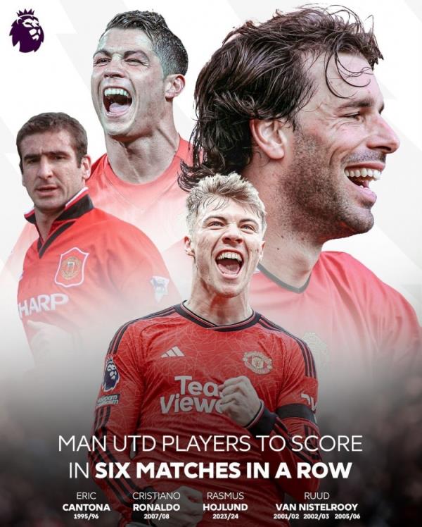 据英超官方统计,霍伊伦成为了曼联队史第四位连续6场英超都取得进球的球员,此前三位分别是坎通纳、范尼和C罗。