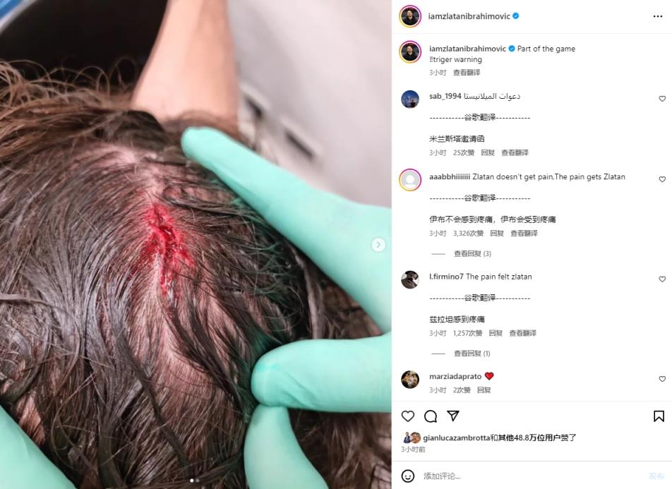 伊布在Instagram晒出了自己头顶开口缝针的照片,并配文:“比赛的一部分,高能预警!”