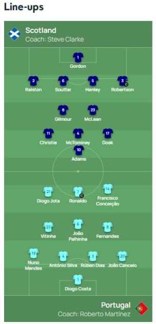 10月16日讯 欧国联A联赛第4轮,葡萄牙客场对阵苏格兰。赛前,官方公布了本场的首发名单。