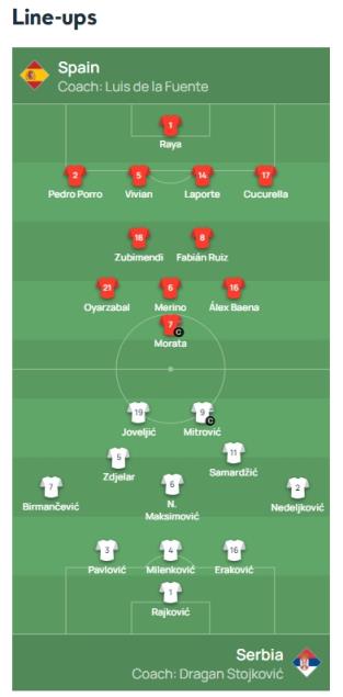 西班牙首发:1-拉亚、2-波罗、5-达尼-维维安、14-拉波尔特、17-库库雷利亚、18-祖比门迪、6-梅里诺、8-法比安、21-奥亚萨瓦尔、16-巴埃纳、7-莫拉塔