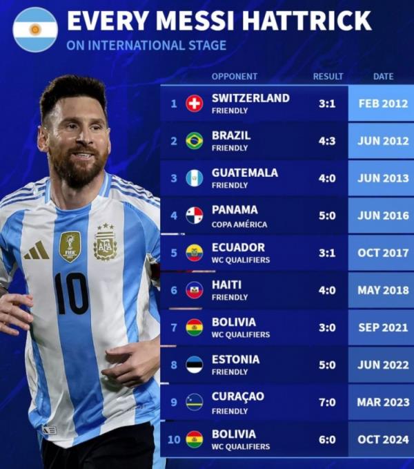 而梅西在赛后采访被问及此事时还毫不知情,对此直言:“呃......老实说,我并不知道有这么回事,我不是那种关注数据的人,但能够再次取得进球是好事”。《转会市场》则盘点了梅西在阿根廷队的10次帽子戏法经历。