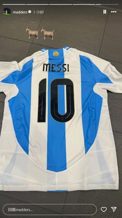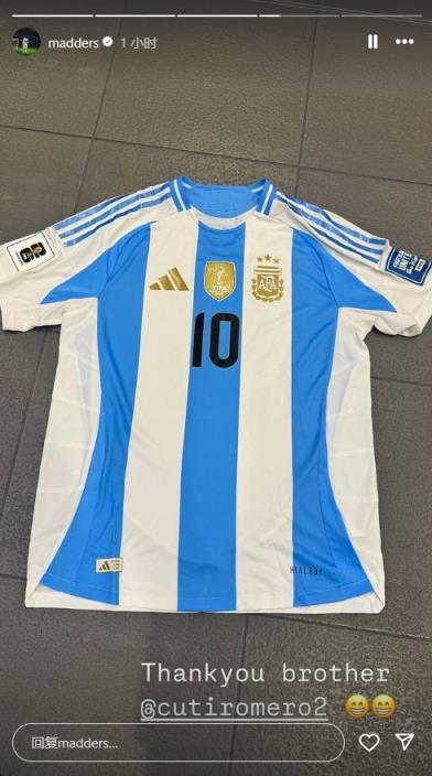 10月19日讯 热刺中场麦迪逊在Instagram发动态,晒出了自己拿到的梅西的阿根廷10号球衣。