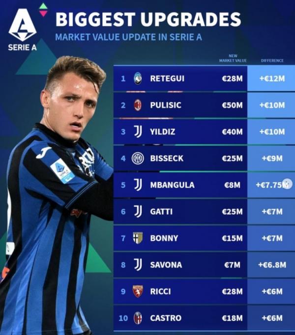 10月19日讯 《转会市场》在今日更新意甲球员身价,3人上涨至少1千万欧元。