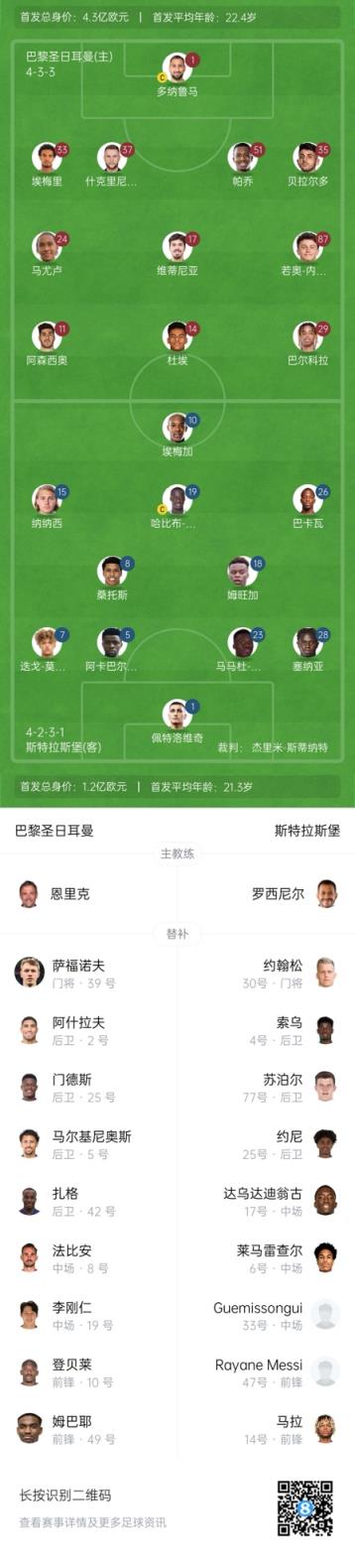 巴黎圣日耳曼首发:1-多纳鲁马、35-贝拉尔多、37-什克里尼亚尔、51-帕乔、17-维蒂尼亚、24-马尤卢、33-扎伊尔-埃梅里、87-若奥-内维斯、11-阿森西奥、14-杜埃、29-巴尔科拉