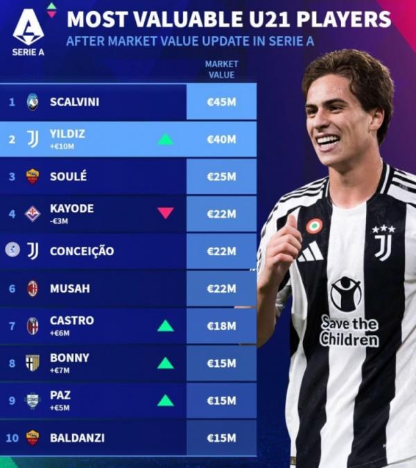 10月20日讯 《转会市场》在近日更新了意甲球员身价,并统计了U21球员身价情况。