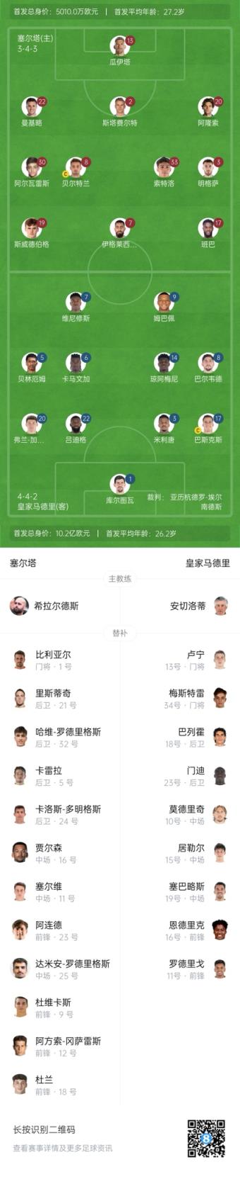 塞尔塔首发:13-瓜伊塔、2-卡尔-斯塔菲尔特、3-明格萨、20-马科斯-阿隆索、22-曼基略、8-贝尔特兰、19-斯维贝里、33-索特洛、7-博尔哈-伊格莱西亚斯、17-乔纳森-班巴、30-雨果-阿尔瓦雷斯