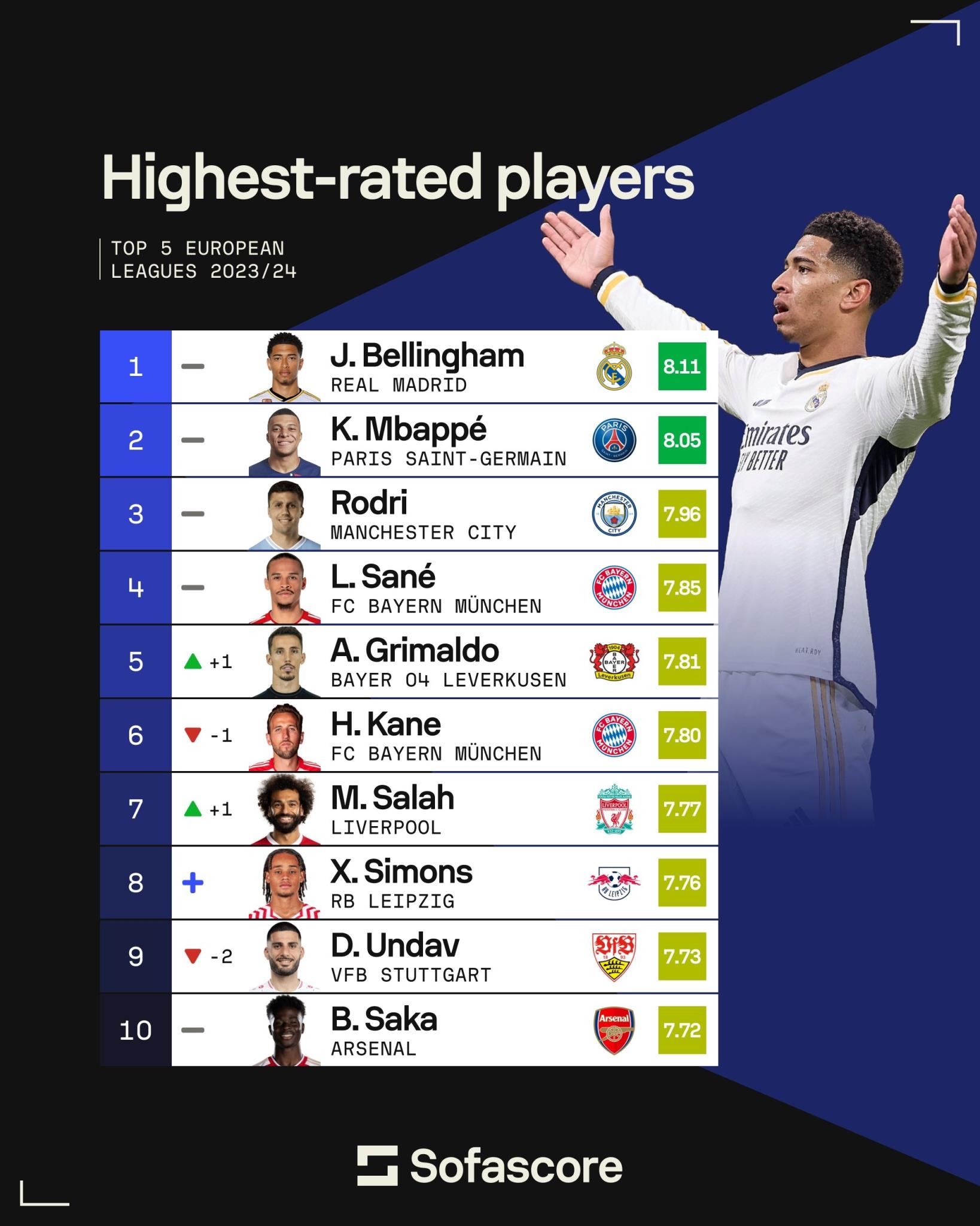 2月21日讯 根据数据网站Sofascore的统计,贝林厄姆是本赛季五大联赛平均评分最高的球员,达到8.11分,姆巴佩8.05分第二。