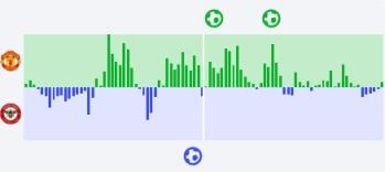 本场两队的进攻势头如图所示,曼联在上半场中后段以及下半场前中段攻势猛烈,在下半场打入2球逆转比赛。全场比赛曼联射门23脚,射正11次,布伦特福德则是8射2正。