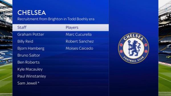 随着朱厄尔加盟切尔西,自伯利接手以来,切尔西一共从布莱顿引进11人,包括8位工作人员(波特、里德、汉伯格、萨尔托、罗伯茨、麦考利、温斯坦利、朱厄尔)和3位球员(库库雷利亚、桑切斯、凯塞多)。