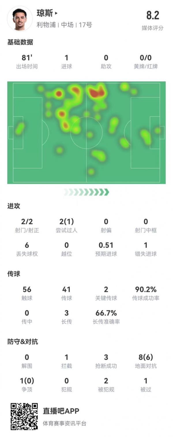 10月21日讯 利物浦在本轮英超2-1领先切尔西,琼斯本场数据如下: