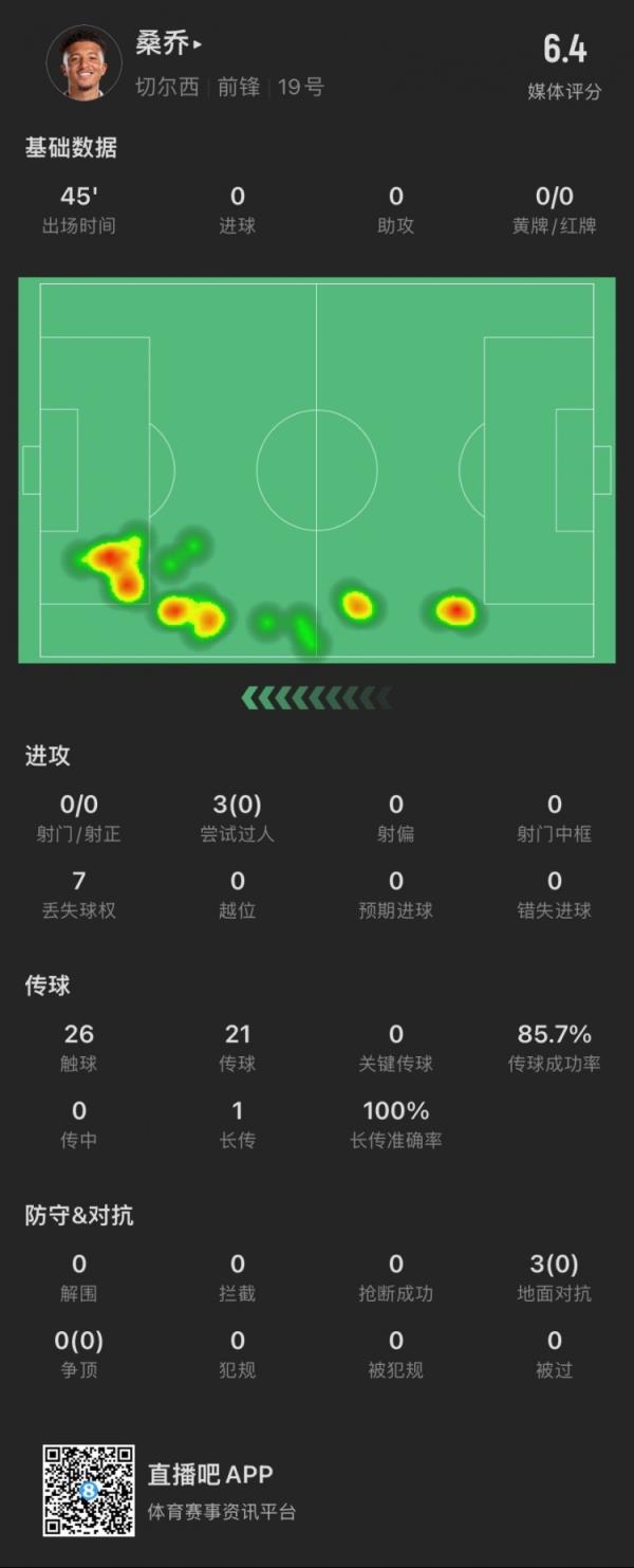 10月21日讯 英超第8轮切尔西客战利物浦的焦点战正在进行。中场时,桑乔被内托换下,获评Sofascore6.4分的评分。