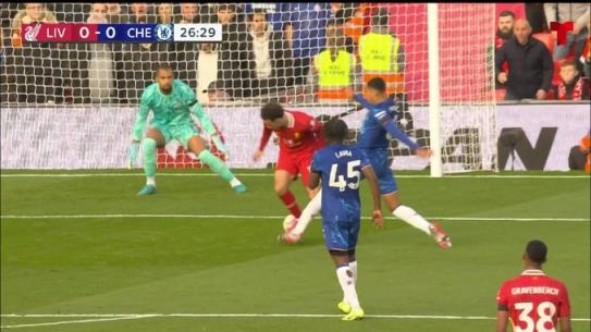 10月21日讯 英超第8轮焦点战,利物浦主场迎战切尔西,比赛第26分钟,科尔维尔踢倒琼斯,裁判判罚点球!随后,萨拉赫主罚点球命中!