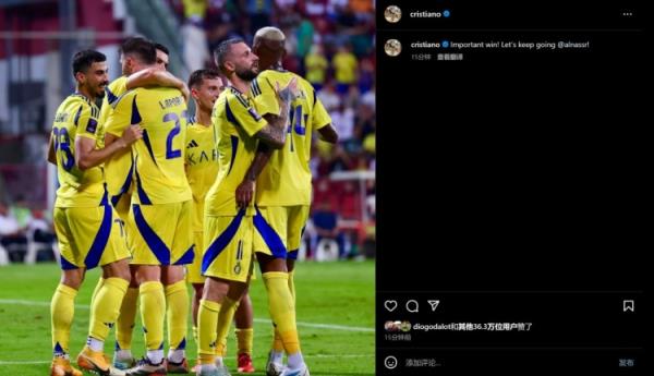 C罗晒出全队庆祝时的合照,并写道:重要的胜利!让我们继续加油。@利雅得胜利。