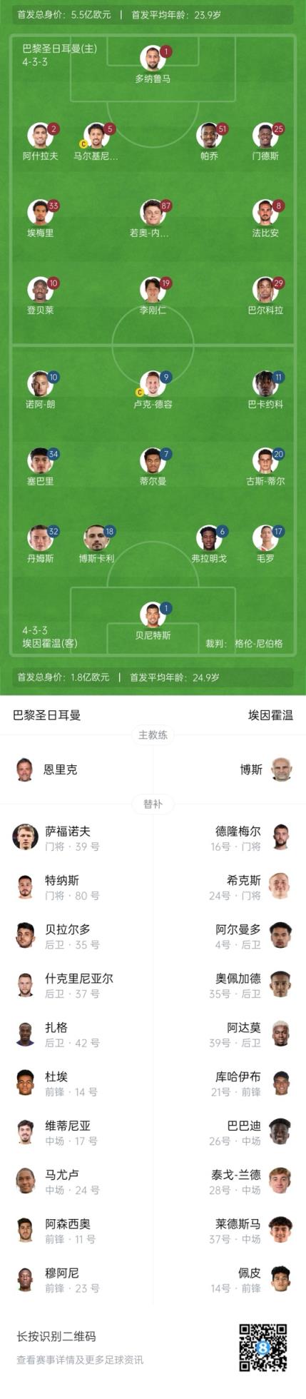 巴黎首发:1-多纳鲁马、2-阿什拉夫、5-马尔基尼奥斯、25-努诺-门德斯、51-帕乔、8-法比安、33-扎伊尔-埃梅里、87-若昂-内维斯、10-登贝莱、19-李刚仁、29-巴尔科拉
