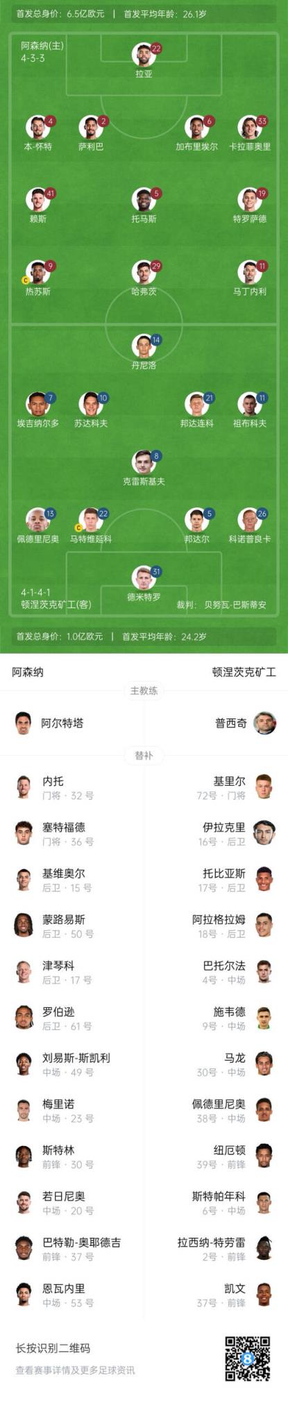 10月23日讯 欧冠联赛阶段第3轮,阿森纳对阵顿涅茨克矿工,赛前首发公布。