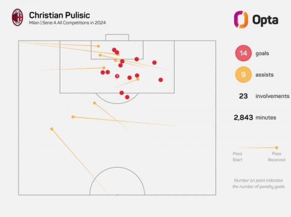 数据统计显示,在本场比赛之前,普利西奇在今年各项赛事为米兰贡献14球9助攻,和莱奥(12球11助攻)并列为今年为俱乐部直接参与进球最多的意甲球员。而此次直接角球破门,也让他得以独享榜首。