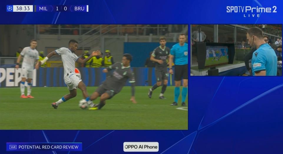10月23日讯 米兰vs布鲁日第40分钟,奥涅狄卡踩踏赖因德斯脚踝,裁判看VAR后对奥涅狄卡出示红牌!米兰多打一人。
