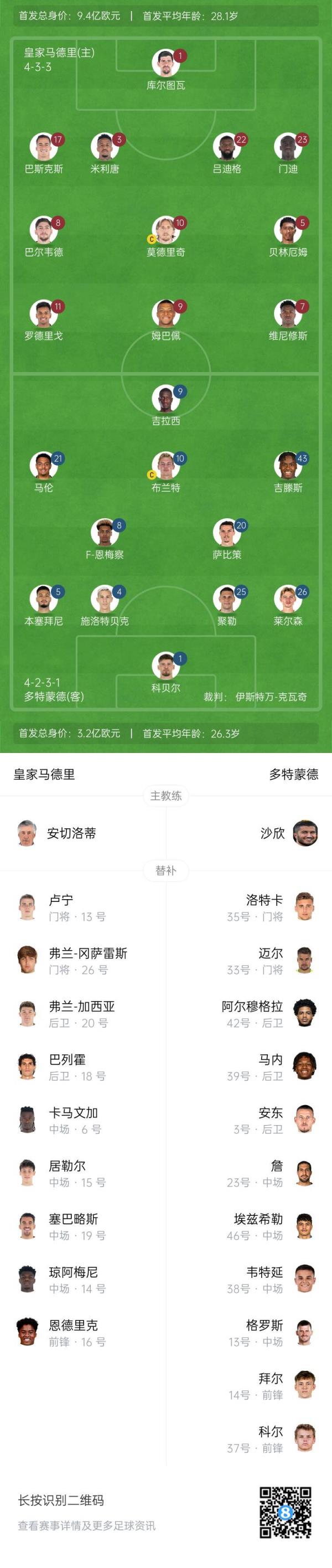 10月23日讯 欧冠联赛阶段第3轮,皇马主场对阵多特。赛前,官方公布了本场的首发名单。