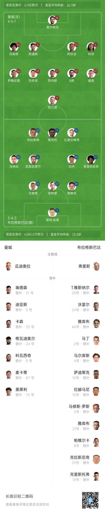 曼城首发:18-奥尔特加、82-刘易斯、5-斯通斯、25-阿坎吉、6-阿克、19-京多安、20-B席、27-努内斯、26-萨维尼奥、47-福登、9-哈兰德
