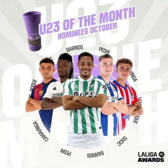 10月24日讯 西甲官方公布10月最佳U23球员候选名单,候选球员是佩德里、卡马文加、罗克、卢卡-苏西奇以及巴里奥斯。