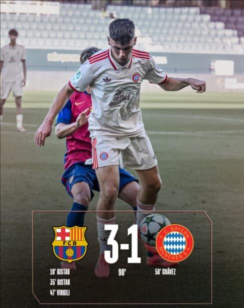10月24日讯 青年欧冠结束联赛阶段第3轮第二比赛日争夺,巴萨3-1击败拜仁,莱比锡3-1击败利物浦。