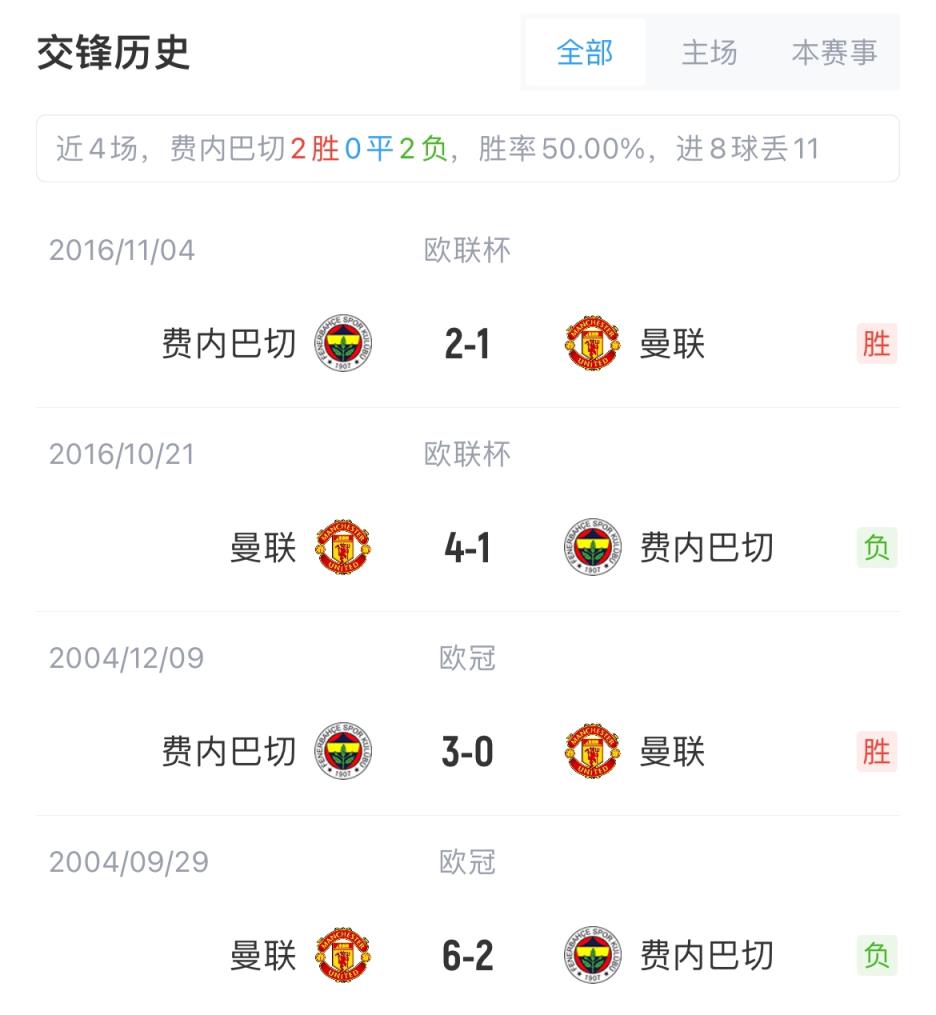 费内巴切前两轮1胜1平,暂排第14。曼联遭遇两连平,暂排第21名。曼联与费内巴切历史共交手6次,3胜3负平分秋色。两队上一次对阵费内巴切2-1战胜曼联,当时红魔主帅还是穆里尼奥。