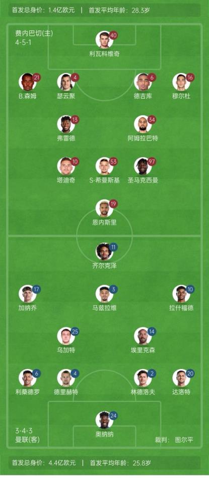 费内巴切首发:40-利瓦科维奇、16-穆尔杜、4-瑟云聚、6-德吉库、21-萨穆尔、53-希曼斯基、34-阿姆拉巴特、13-弗雷德、10-塔迪奇、19-恩内斯里、97-圣马克西曼