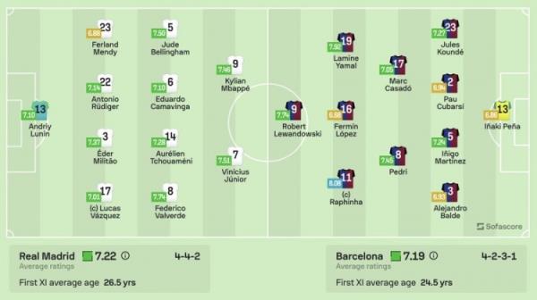 巴萨在本周中主场4-1复仇拜仁,他们在今日排出了完全一致的首发阵容;皇马则在此前5-2逆转多特,虽然有3处人员调整,但其中库尔图瓦和罗德里戈都是因伤缺阵,仅上一场首发的老将莫德里奇本场替补待命。卢宁、琼阿梅尼和卡马文加在本场替代首发。