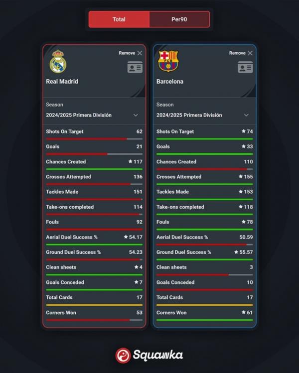 10月27日讯 皇马将在本轮西甲焦点战迎战巴萨,两队已经公布了首发名单。squawka也对比了两队本赛季西甲的关键数据: