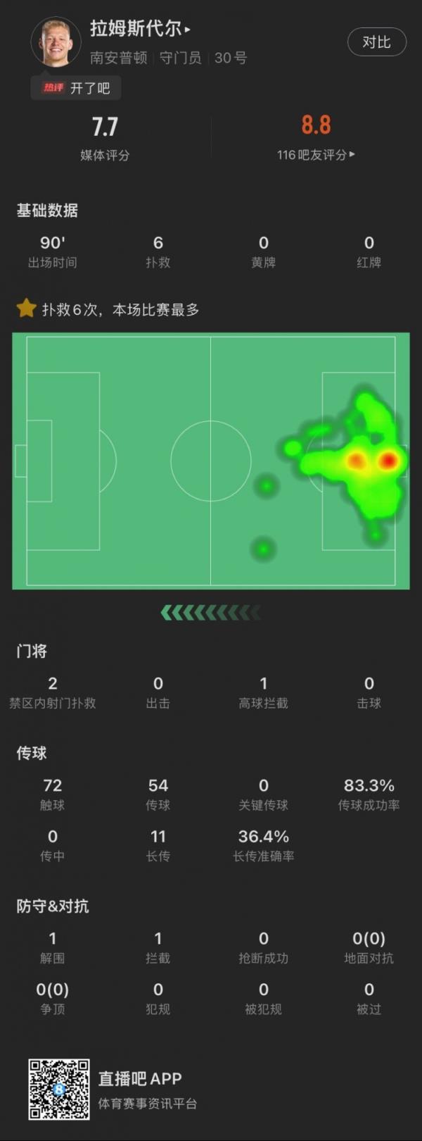 10月27日讯 英超第九轮,南安普顿客场0-1不敌曼城。本场比赛,枪手旧将拉姆斯代尔发挥神勇,但仍然没能保持零封。他全场6次扑救,丢掉1球,获得SofaScore7.7分的评分,是队内最高。