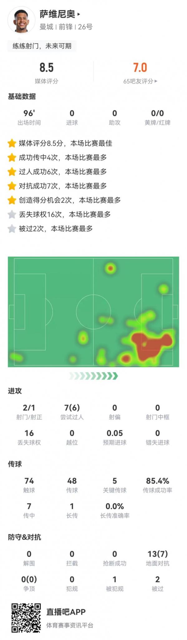 10月26日讯 曼城在本轮英超1-0力克南安普顿,萨维尼奥本场数据如下: