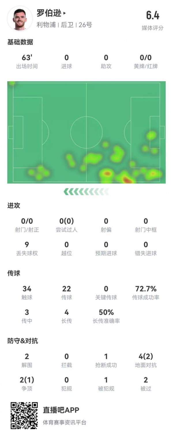 10月28日讯 利物浦在本轮英超对阵阿森纳,罗伯逊本场数据如下: