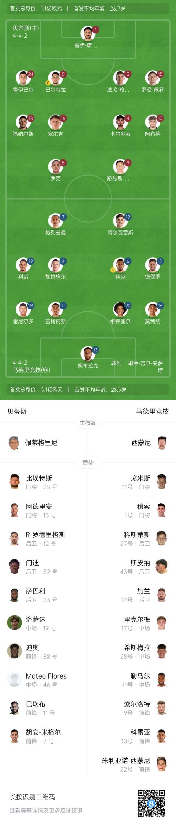 10月28日讯 西甲第11轮,马竞客场对阵贝蒂斯。赛前,官方公布了本场的首发名单。