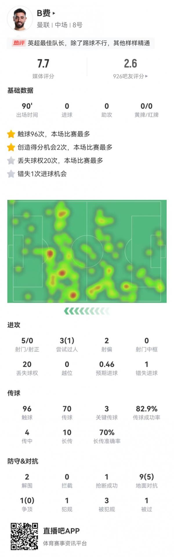10月28日讯 曼联在本轮英超1-2不敌西汉姆,B费本场数据如下: