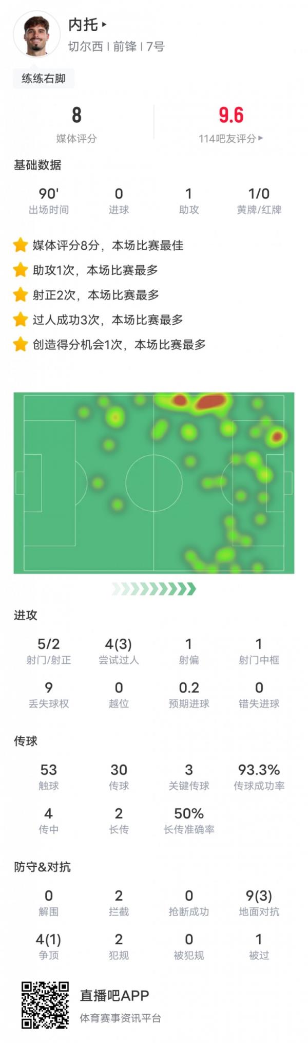 10月28日讯 本赛季英超联赛第9轮,切尔西主场2-1纽卡斯尔。内托首发出战,贡献1次助攻,3次过人成功,送出3次关键传球,评分8.0全场最高。