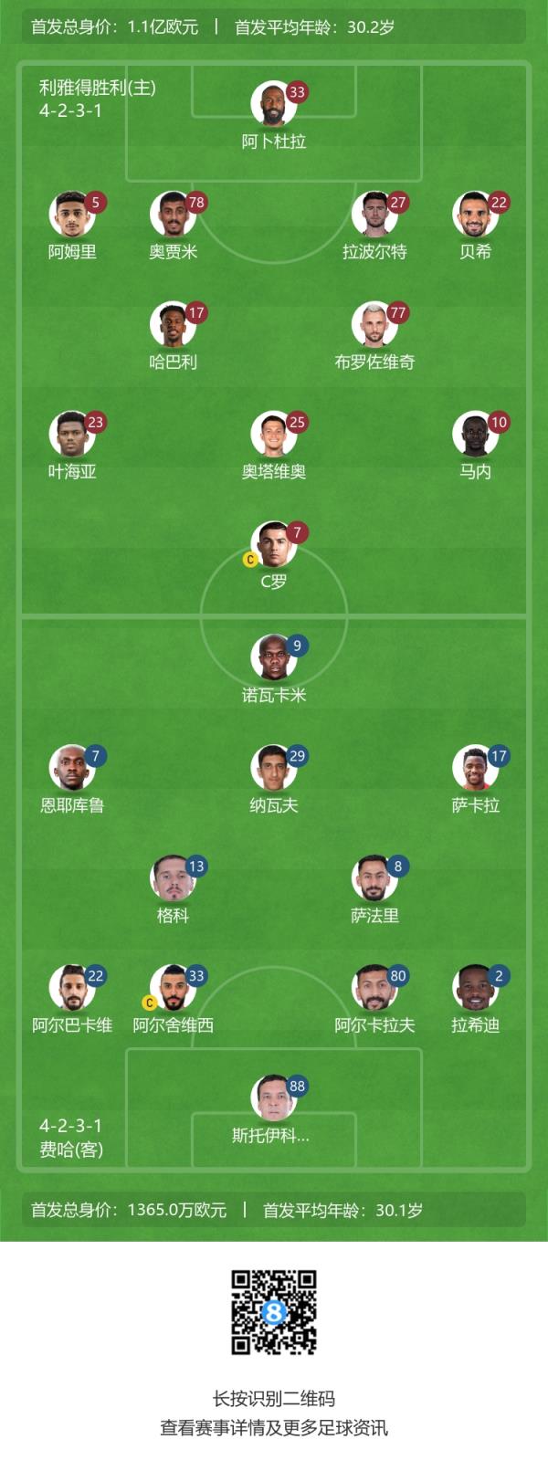 利雅得胜利首发:33-瓦利德、5-阿卜杜拉-阿姆里、27-拉波尔特、78-奥贾米、22-比伊奇、17-哈巴利、77-布罗佐维奇、23-叶海亚、25-奥塔维奥、10-马内、7-C罗