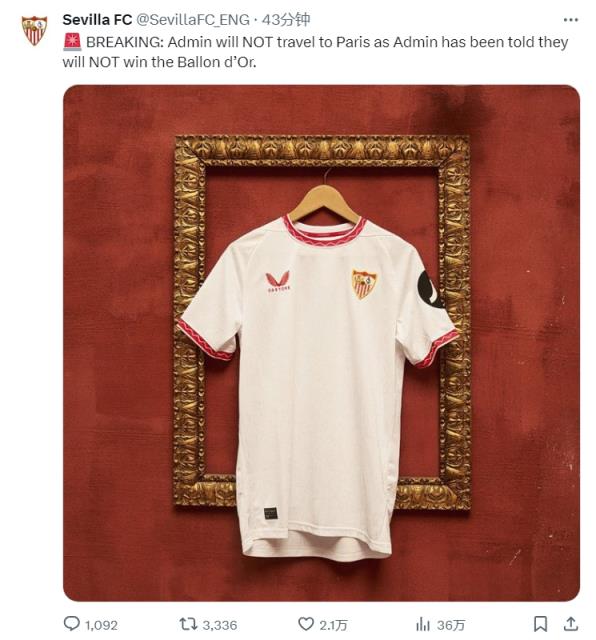 塞维利亚官推写道:“突发新闻!小编将不会前往巴黎,因为小编被告知自己将不会赢得金球奖。”