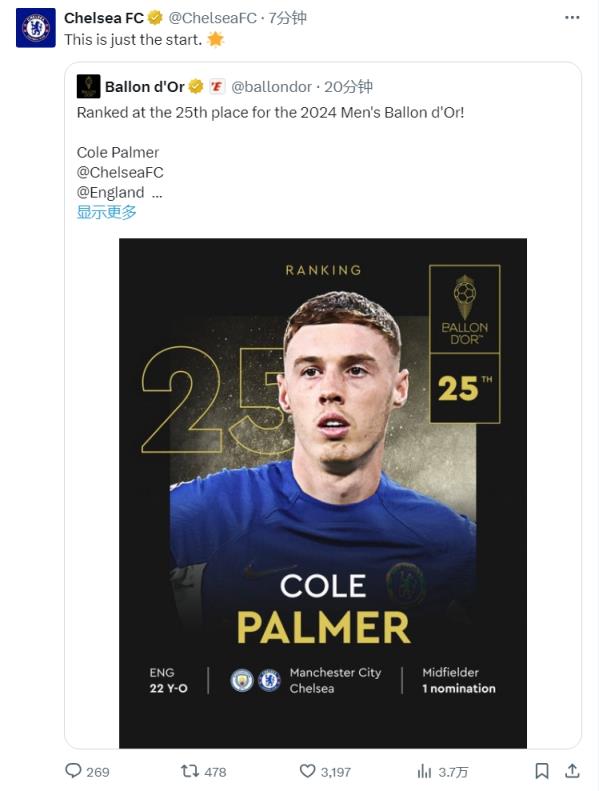 切尔西官方也向队内当家球星送上了祝贺,写道:这仅仅只是开始。