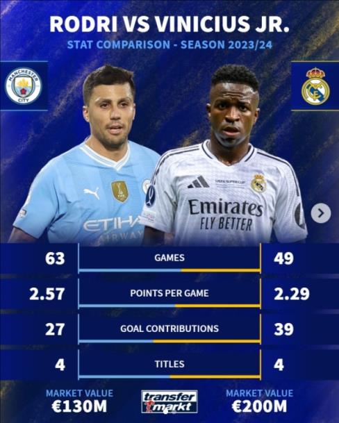 10月29日讯 金球奖颁奖典礼今晚进行,德国转会市场网官方社媒对比了罗德里和维尼修斯上赛季的数据。