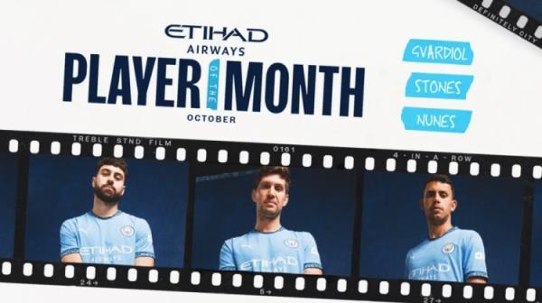 11月1日讯 曼城官网公布10月队内最佳球员候选,获提名的3名球员为格瓦迪奥尔,斯通斯、努内斯。