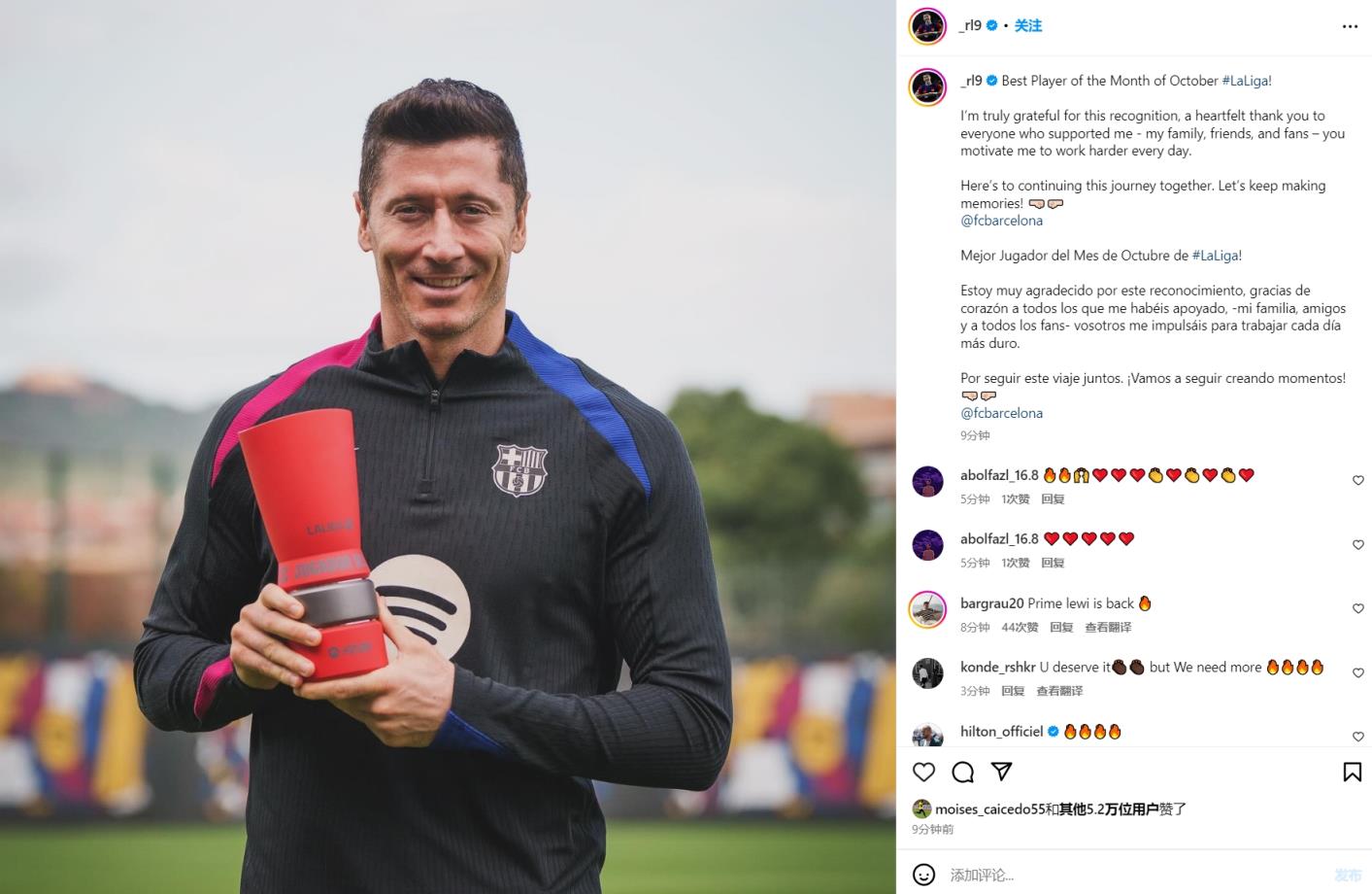 在个人社媒,莱万晒出自己领取西甲月最佳球员奖杯的照片,同时配文:“10月份西甲最佳球员,我很感谢对我的认可,同时也衷心感谢所有支持我的人,家人、朋友、球迷,你们激励我每天更加努力地工作。让我们一起继续这段旅程,继续创造回忆!