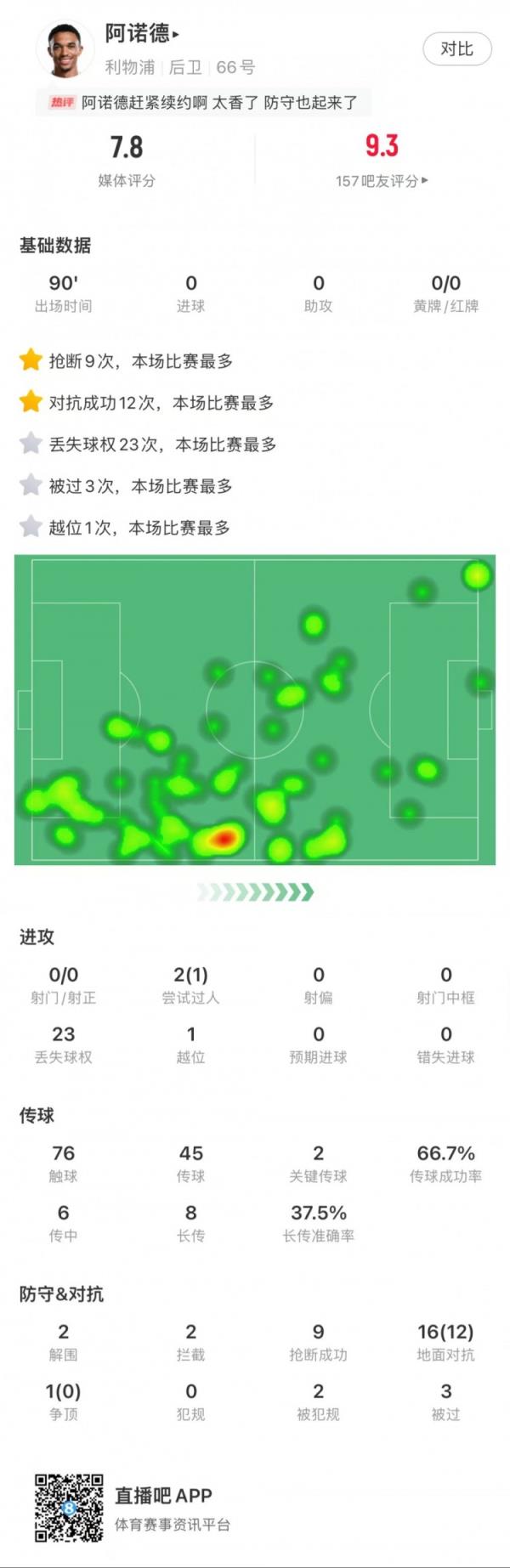 根据统计,阿诺德成为了2021年自己之后,英超第一位单场比赛创造1次得分良机,完成至少9次抢断的球员。
