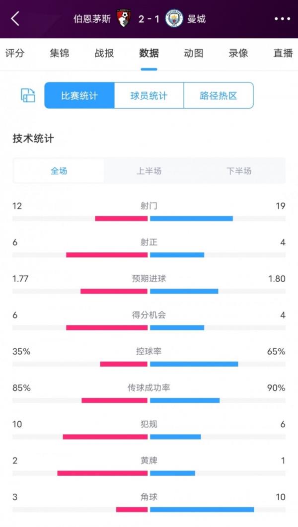 11月3日讯 英超第10轮,曼城客场1-2不敌伯恩茅斯。以下为本场比赛双方全场数据对比: