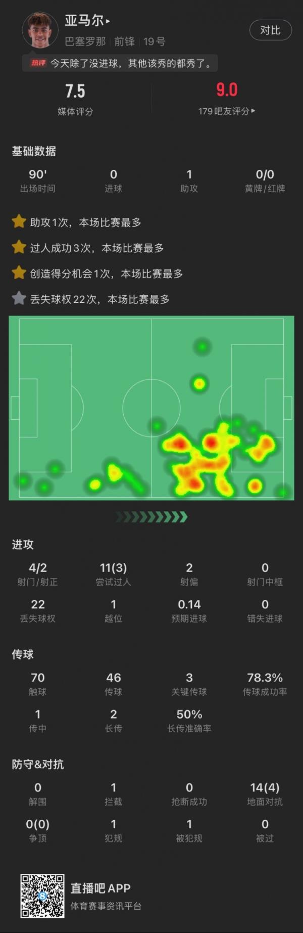 11月4日讯 在刚刚结束的西甲比赛中,巴萨3-1击败西班牙人,赢下本赛季首回合加泰德比。本场比赛,亚马尔送出1次助攻,获评Sofascore7.5的评分。