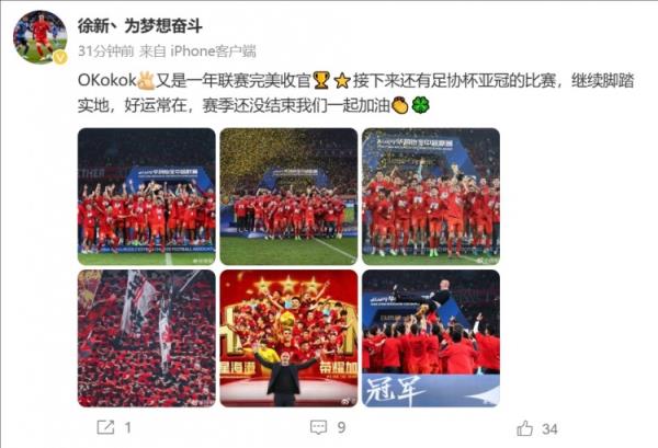在个人社媒,徐新晒出海港庆祝联赛夺冠的照片,同时配文:OKokok 又是一年联赛完美收官
