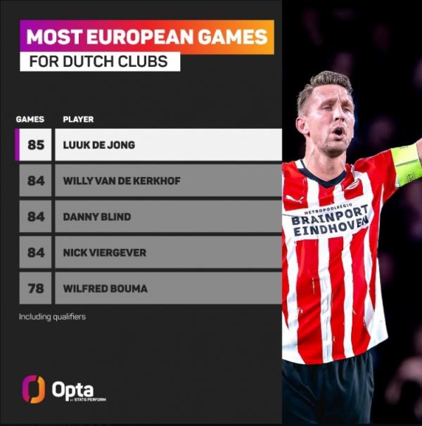 欧冠联赛阶段第4轮,埃因霍温主场对阵赫罗纳,34岁中锋卢克-德容首发出战,这是他第85次代表荷兰球队出战欧战,为历史最多。