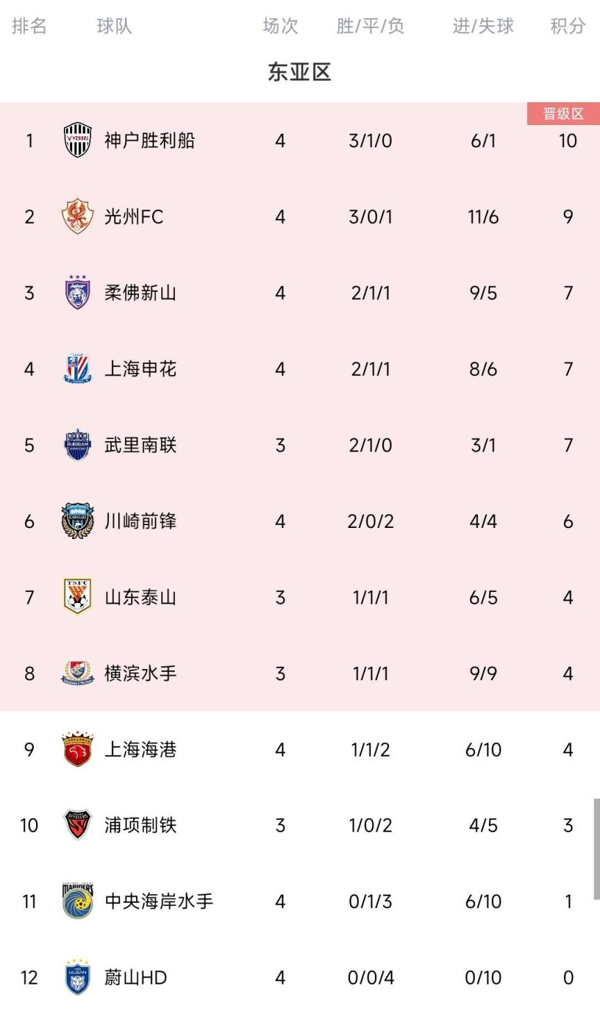 东亚区第4轮,中超冠军上海海港1-3不敌川崎前锋,4轮后1胜1平2负积4分暂列第9位,韩国K1联赛冠军蔚山HD0-3不敌柔佛DT,4轮皆败进0球丢10球,位列第12位。