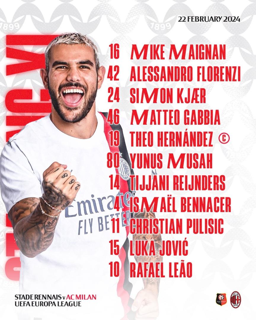 02月23日讯 欧联杯1/8决赛附加赛次回合,雷恩主场vsAC米兰,首回合米兰3-0获胜,本场比赛米兰主力出战。