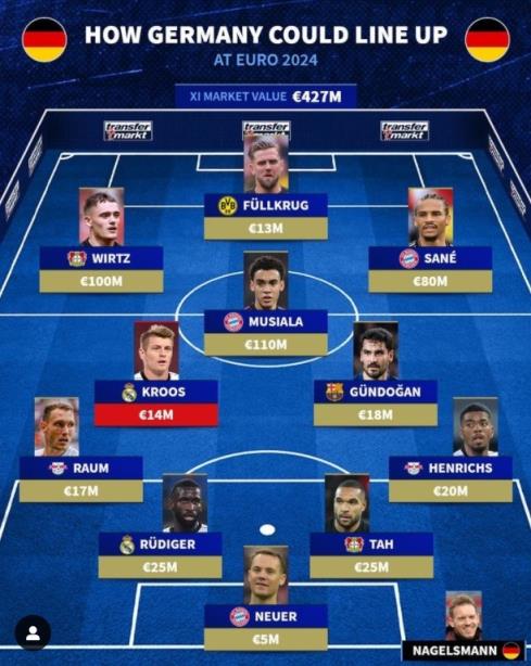 2月23日讯 克罗斯官宣回到德国国家队,德国转会市场网预测德国队欧洲杯首发,克罗斯、京多安和穆西亚拉搭档中场。