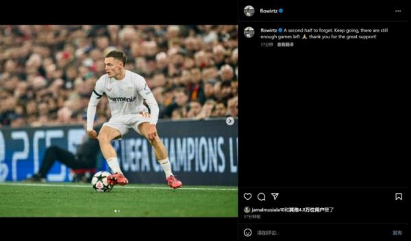 11月7日讯 欧冠联赛阶段第四轮,勒沃库森0-4不敌利物浦。赛后,维尔茨更新了社媒,为球队鼓舞士气。